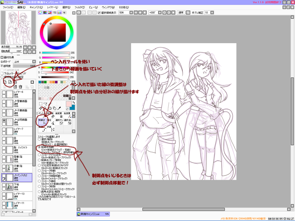 saiのペン入れツールは便利で、気にくわない線も制御点をいじれば…